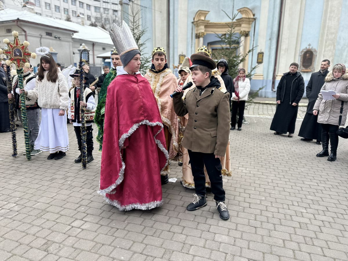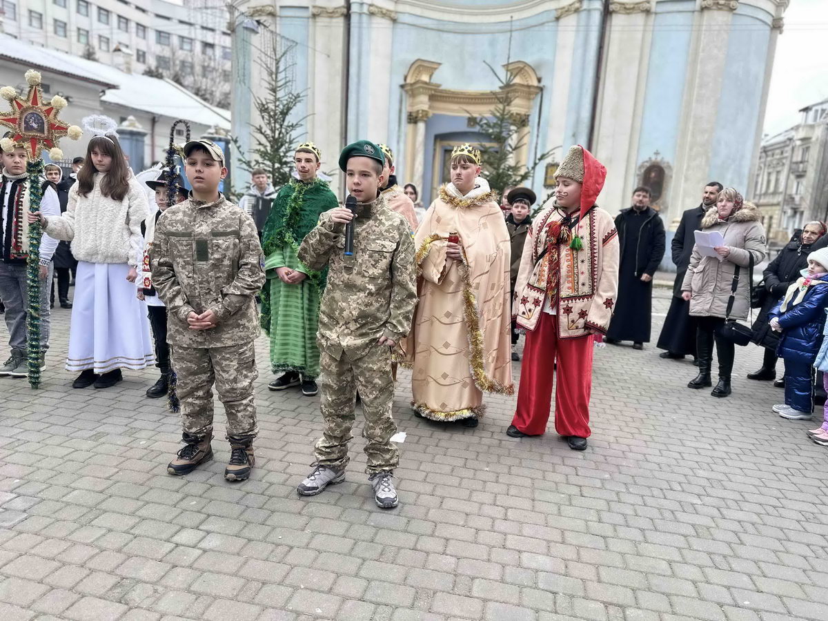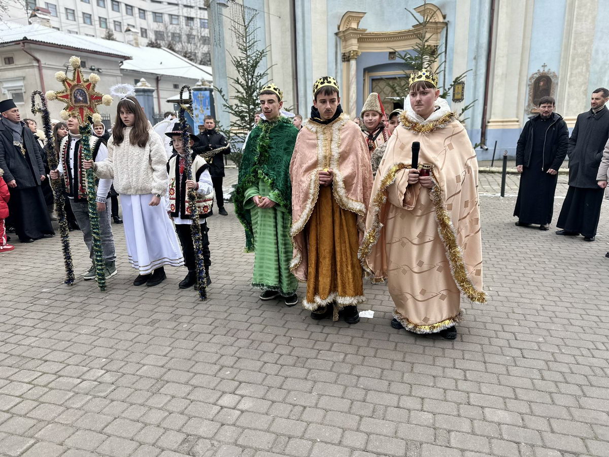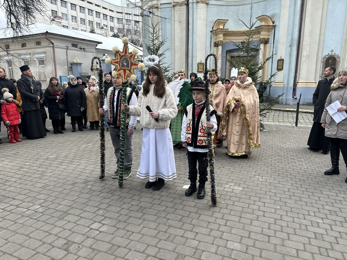 Після Богослужіння процесія вірних вийшли на передсоборову площу імені Патріарха Мстислава, де стараннями дітей та вчителів села Гринівці Тлумацького деканату було проведено Різдвяний вертеп.